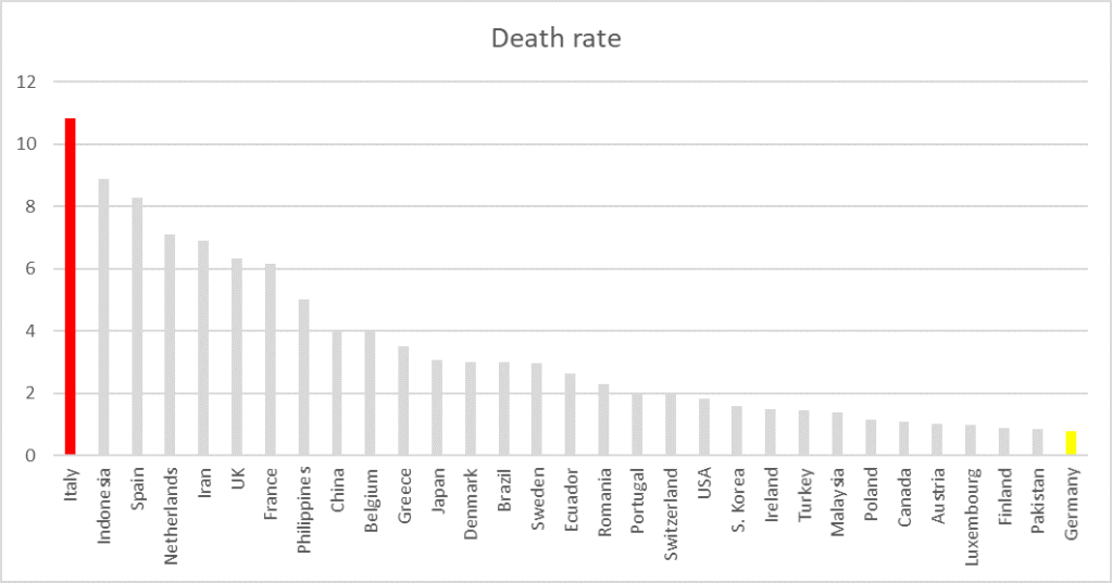 Buna səbəb isə, İtaliyanın 65 yaşdan yuxarı əhalinin bütün əhali üzrə fazinə görə dünyada Yaponiyadan sonra ikinci yerdə qərarlaşmasıdır (23%). Bəs nəyə görə Almaniyanın bu siyahıda 21 faizlə altıncı yerdə olmasına baxmayaraq ölüm nisbəti bu qədər aşağıdır? (0.8%). Buna əsas səbəblərdən biri səhiyyənin keyfiyyəti göstərilə bilər. Legathum Prosperity İndexinin səhiyyə bölməsinin qayğı elementinə görə Almaniya dünya üzrə bütün ölkələrə liderlik edir.